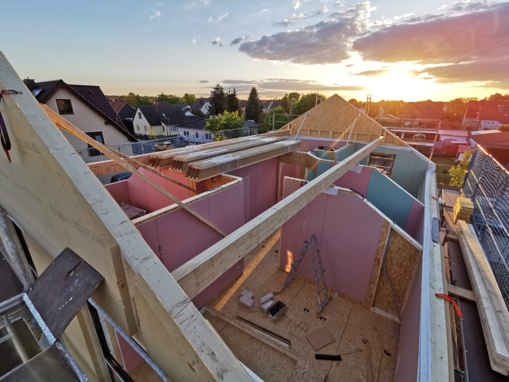Durch den konsequenten Einsatz ökologischer Dämmstoffe auf Holzfaserbasis wird eine sehr gute Wärmedämmung bei gleichzeitig hervorragendem sommerlichem Hitzeschutz erreicht. Die Konstruktion vereint Nachhaltigkeit, Energieeffizienz und ein angenehmes Raumklima.